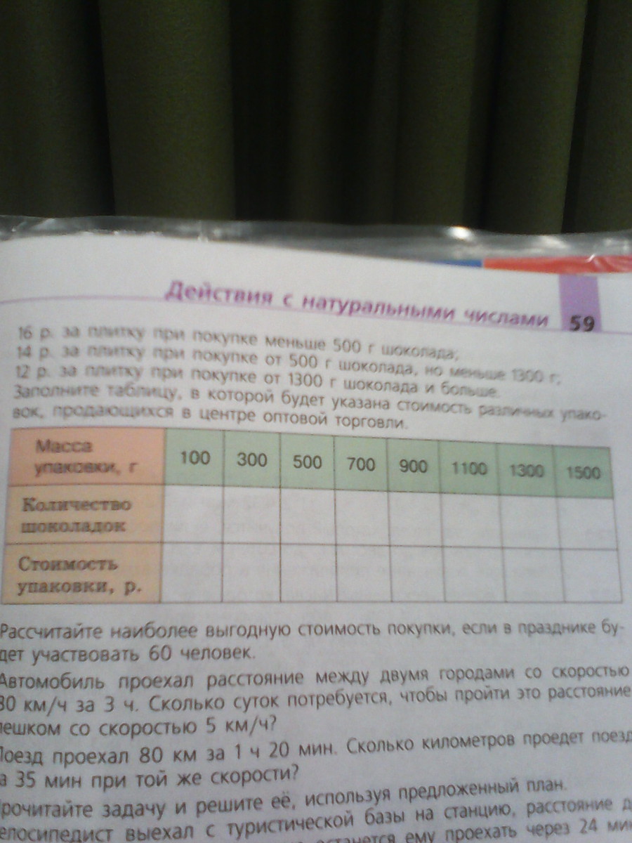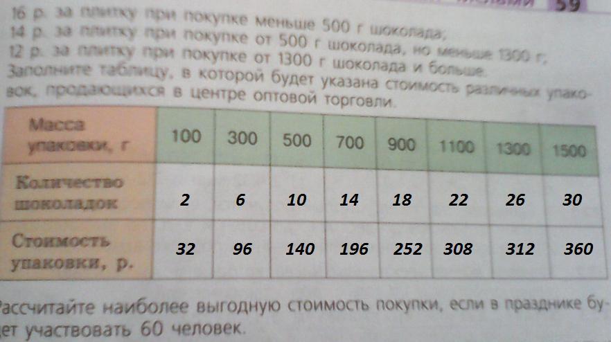 Представьте, что вам поручено купить для участников школьного праздника шоколадки массой 50 грамм в центре оптовой торговли продаются упаковки таких шоколадок, при этом цена одной плитки зависит от массы упаковки: 16 руб. за плитку при покупки меньше 500 грамм шоколада; 14 руб. за плитку при покупке от 500 грамм шоколада но меньше 1.300 грамм; 12 руб. за плитку при покупке от 1.300 грамм шоколада и больше.