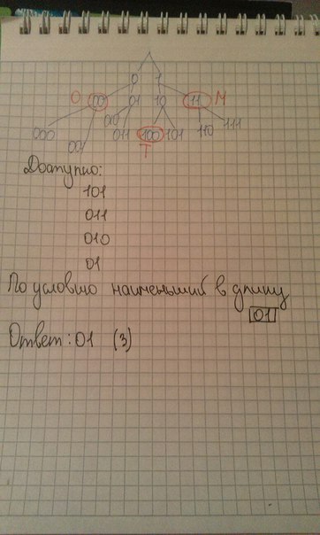 По каналу связи передаются сообщения, содержащие только 4 буквы А Т О М для передачи используется двоичные код, допускающих однозначно декодирование. Для букв Т О М используются такие кодовые слова Т: 100, О:00, М:11. Укажите такое кодовое слово для буквы А, при котором код будет допускать однозначно деколирование. Если таких кодов несколько, укажите тот, у которого меньше длина.