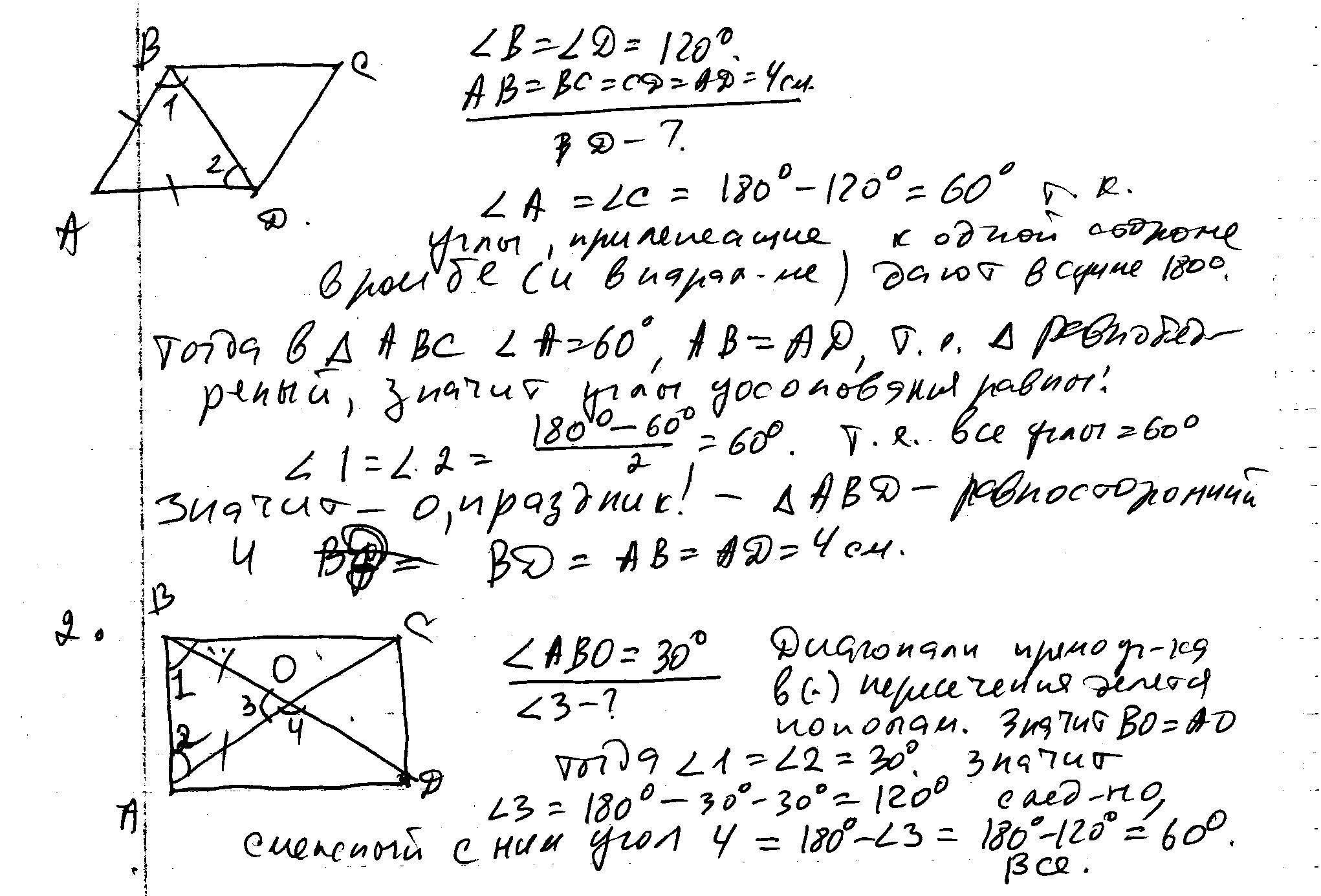1.Сторона ромба с углом 120 градусов равна 4 см. Найдите его меньшую диагональ.