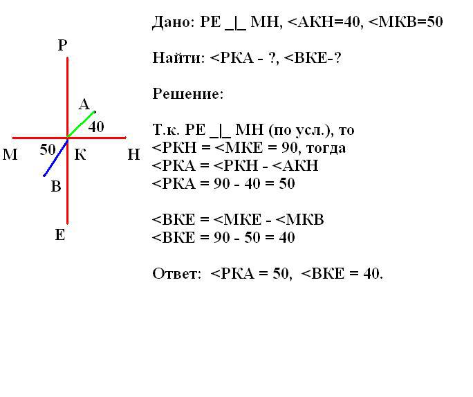 Перпендикулярные прямые РЕ и МН пересекаются в точке К . Внутри угла РНК взята точка А . вну три угла МКЕ-точка В. Угол АКН=40 градусов угол МКВ= 50 градусов. Найди углы РКА и ВКЕ