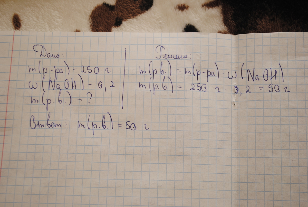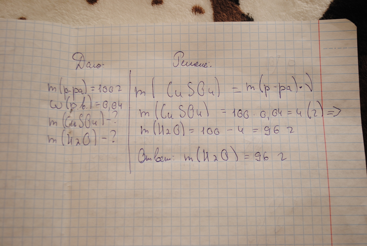 Помогите пожалуйста решить 2 задачки ,желательно на бумаге! 1)Вычислите массу вещества,получившегося при выпаривании 250 г раствора с массовой долей гидроксида натрия 0,2. 2)Рассчитайте массы сульфата меди(II) и воды,которые необходимо взять для приготовления раствора массой 100 г , с массовой долей растворенного вещества 0,04.