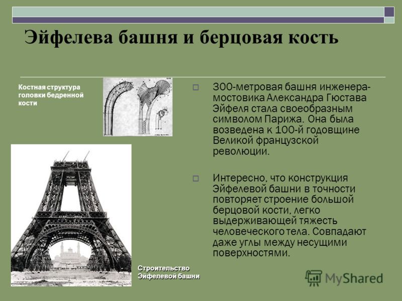 Если посмотреть на распил кости, то, можно заметить, что стенки костей не монолитные, а ажурные, как Эйфелева башня, наука, в которой изучаются возможности применения закономерностей строения живых организмов в технике, называется бионикой