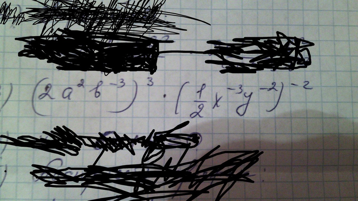 ( 2а²в-³)³×(1/2х-³у-²)-²=2³а^6×в^-9×(1|2)-²x^6y^4=8×4a^6×X^6/в^9=