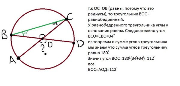 ac и bd- диаметры окружности с центром О. Угол abc равен 34 градусам .Найдите угол aod. Ответ дайте в градусах