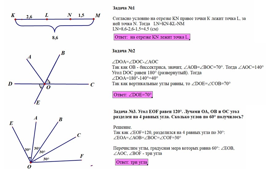 1. На отрезке KM отмечены две точки L и N. Найдите длину отрезка LN, если известно, что KM= 8,6 см, NM = 1,5 см, KL = 2,6 см. Укажите, какая точка лежит на отрезке KN? 2. На заданном рисунке OB биссектриса угла AOC.