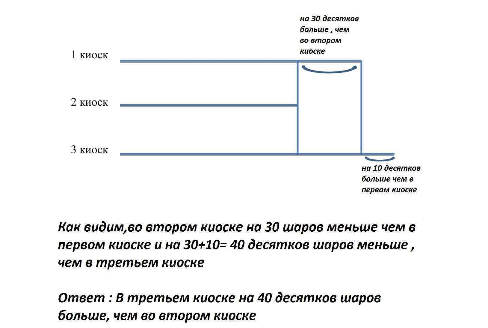 ответ на 40 шаров больше чем во 2ом.1)30-10=20(во 2 киоске) 2 ) 20+30=50(В 1 киоске) 3)50+10=60(в 3 киоске) 4)60-20=40дес(шаров).