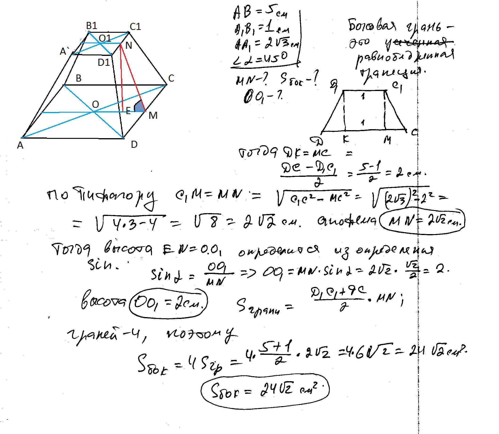 стороны оснований правильной четырехугольной усеченной пирамиды равны 1см и 5см боковое ребро усеченной пирамиды равно 2корень из 3см. боковая грань с плоскостью нижнего основания образует угол 45градусов. найдите1)апофему усеченной пирамиды2)высоту усеченной пирамиды 3)площадь боковой поверхности усеченной пирамиды....... помогите пожалуйста (((((((((