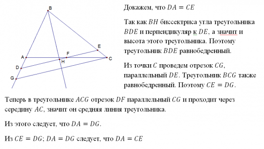 Прямая L проходит через середину стороны AC треугольника ABC перпендикулярно биссектрисе его угла B и пересекает прямые BA и BC в точках D и E соответственно. Докажите что AD=CE