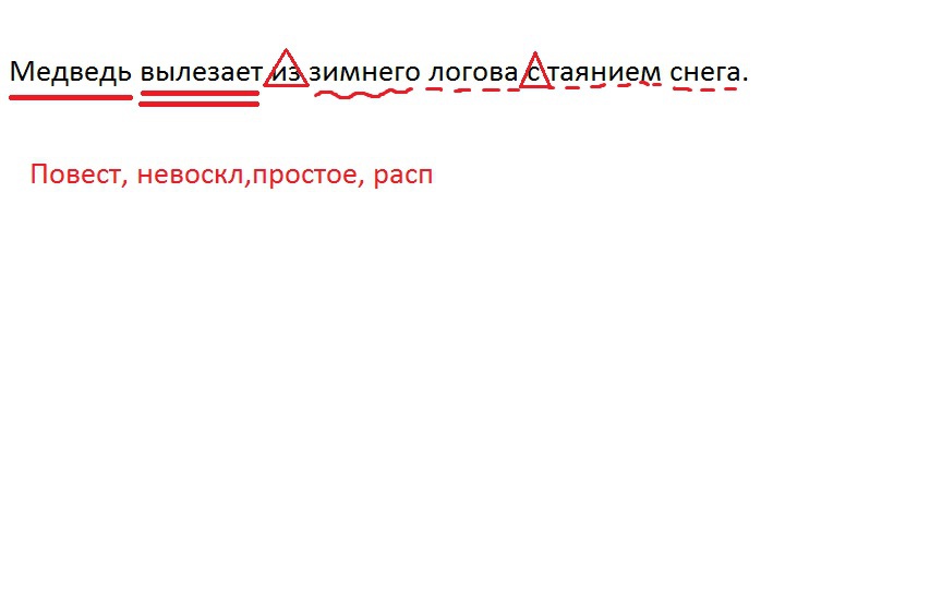 Медведь (сущ) - одной чертой, вылезает (глаг) - двумя чертами, из (предлог) - пунктиром зимнего (прил) - волнистой, логова - (сущ) - пунктиром, с (предлог) - пунктиром, таянием -сущ) - пунктиром, снега (сущ) - пунктиром.