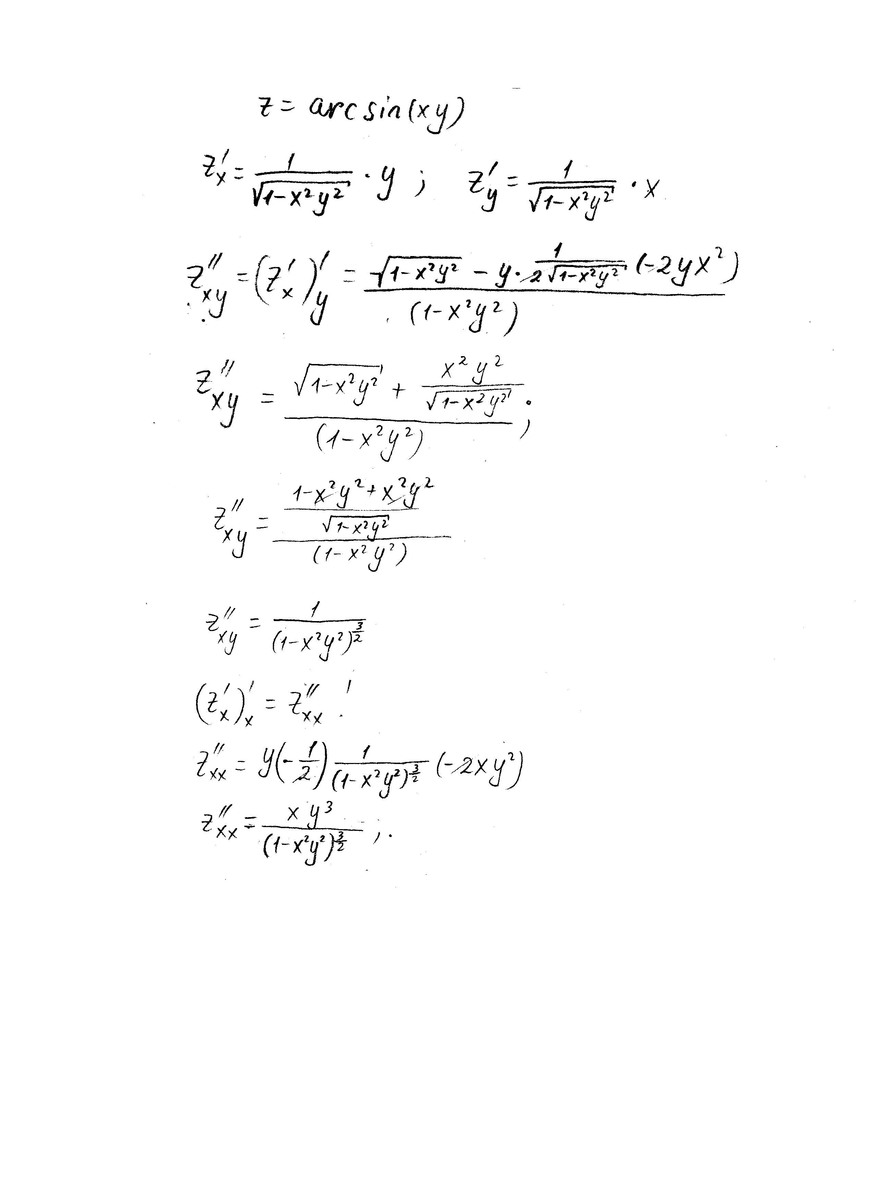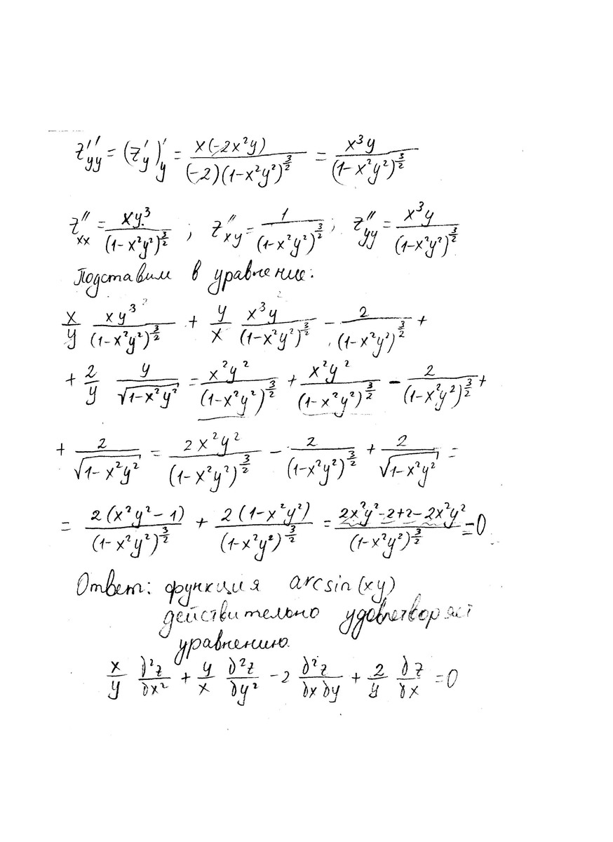 показать что функция z=arcsin(xy) удовлетворяет уравнению x/y*d^2z/dx^2+y/x*d^2z/dxdy+2/y*dz/dx=0