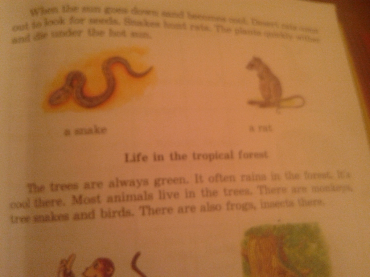 Деревья всегда зелёные. В лесу часто идёт дождь. Там очень классно. Большая часть животных живёт на деревьях. Там много обезьян, змей и птиц. Также там есть всякие лягушки и насекомые