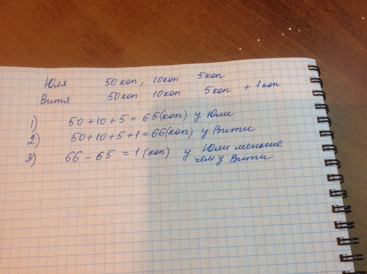 у юли три монеты:50 копеек,10 коп и 5 коп,а у Вити такие же монеты и ещё 1 копейка.сколько денег у каждого?на сколько меньше денег у Юли,чем у Вити?