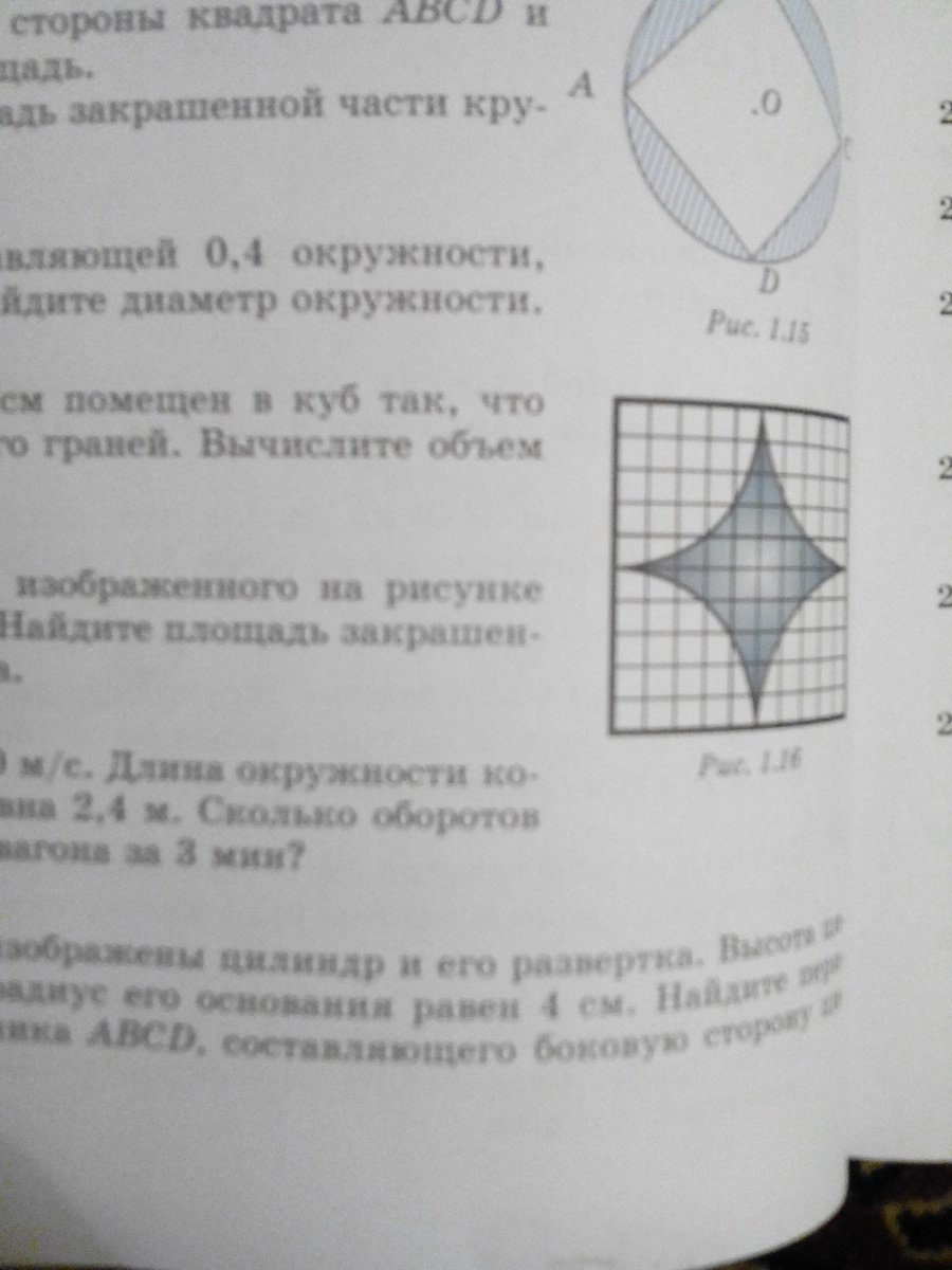 a- сторона квдр, А-площадь ; А квдр= 10см*10см=100см^2; а=10 см➡ r(круга)=10 см :2=5 см. А круг=πr^2 ➡ А круг= 25π см^2. А круг/4=25π/4=6,25π(четверть круга)➡ А всех четвертей =25π=78,5. ➡ А фигуры= А квдр- А круга= 100 см^2-78,5 см^2=21,5 см^2.