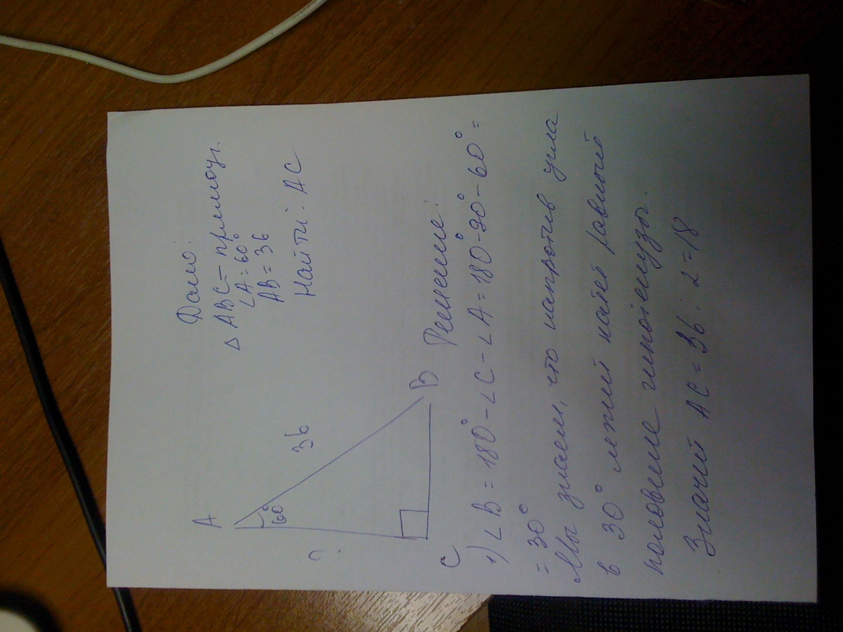 Угол В=90-60=30град. АС лежит напротив угла 30 и равна половине гипотенузы АВ, т.е 1/2*36=18см