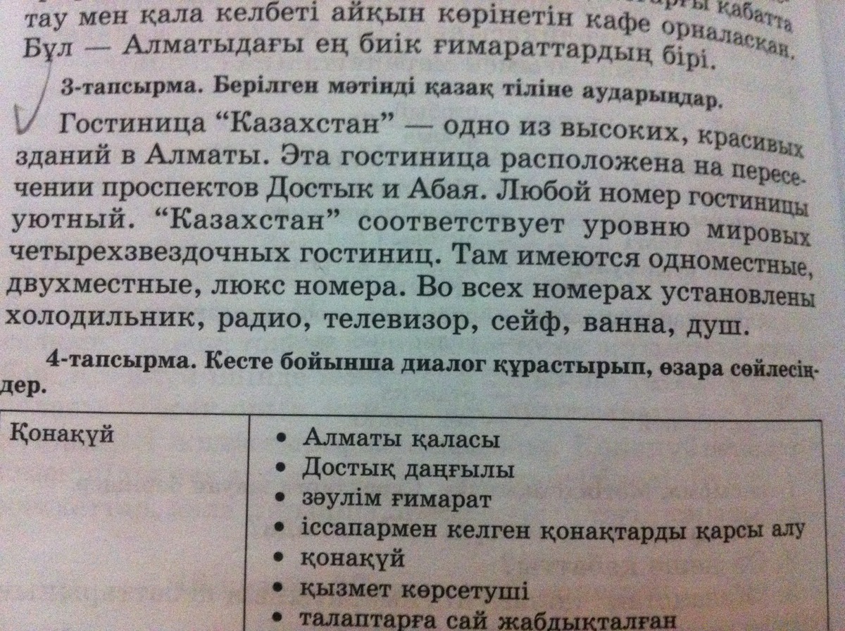 " Казакстан" конак уйи бул Алматыдагы ен адеми ари биик гимараттардын бири. Бул конак уй Достык Жане Абай кошелеринин киылысында орналаскан. Конак уйдин арбир болмеси оте жайлы. " Казакстан" - алемдеги торт жулдызды конак уйдердин денгейине сай келеди. Онда бир, еки болмели Жане люкс болмелери бар. Барлык болмеге тоназыткыш, радио, теледидар,сейф,жуынатын болме мен душ бар.