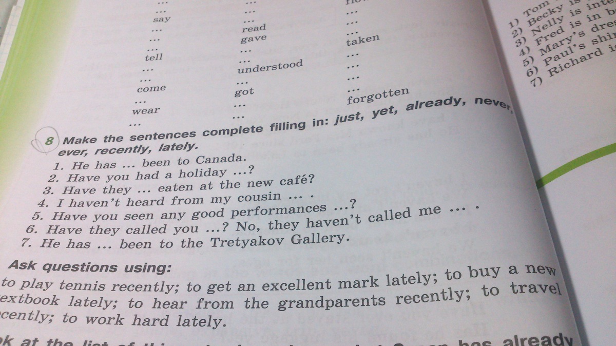 Make the sentences complete filling in :just, yet,already,never,ever, recently, lately