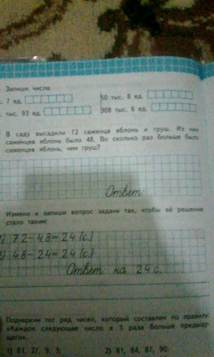 В саду высадили 72 саженца яблонь и оруш.Из них саженцев яблонь было 48. Во сколько раз больше было саженцов яблонь, чем груш.