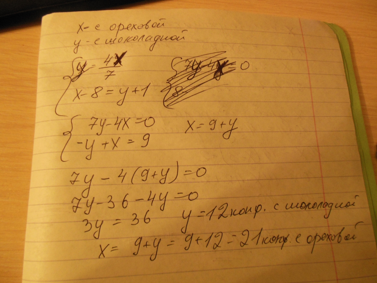 в коробке были конфеты с ореховой и шоколадной начинкой. Количество конфет с шоколадной начинкой составляло четыре седьмых от количества конфет с ореховой начинкой. если из коробки выложить 8 конфет с ореховой начинкой и добавить 1 конфету с шоколадной начинкой станет поровну. сколько всего конфет было в коробке?