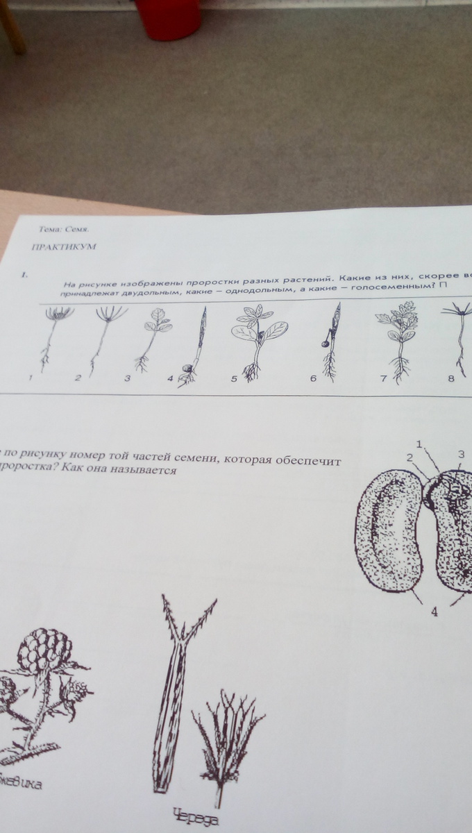 На рисунке изображены проростки разных растений.Какие из них,скорее всего,принадлежат двудольным,какие- однодольным ,а какие-голосеменными?
