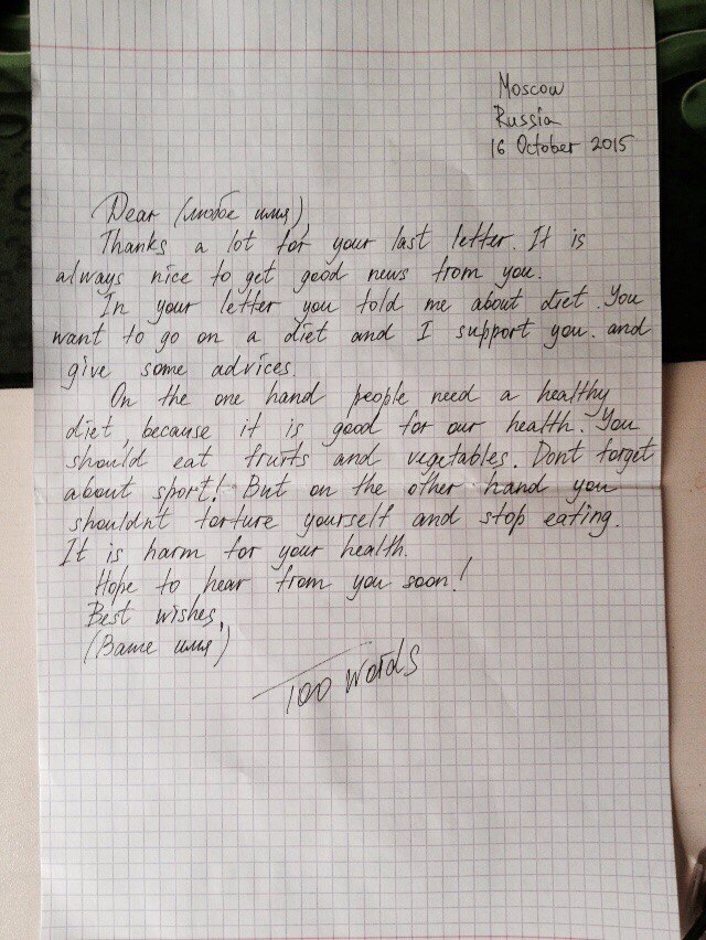 Вы получили письмо от подруги, которая хочет сесть на диету,чтобы похудеть.Она чувствует себя очень не уверено в том, как начать.Напиши ей письмо, давая советы о том, что она может сделать,что бы не навредить себе и приведите аргументы За и Против диеты.