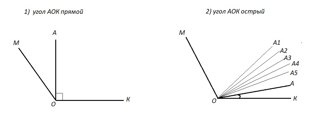 Начертите тупой угол МОК и луч ОА так,чтобы:1)<АОК был прямой;2)<АОК был острый.Сколько таких углов можно построить?