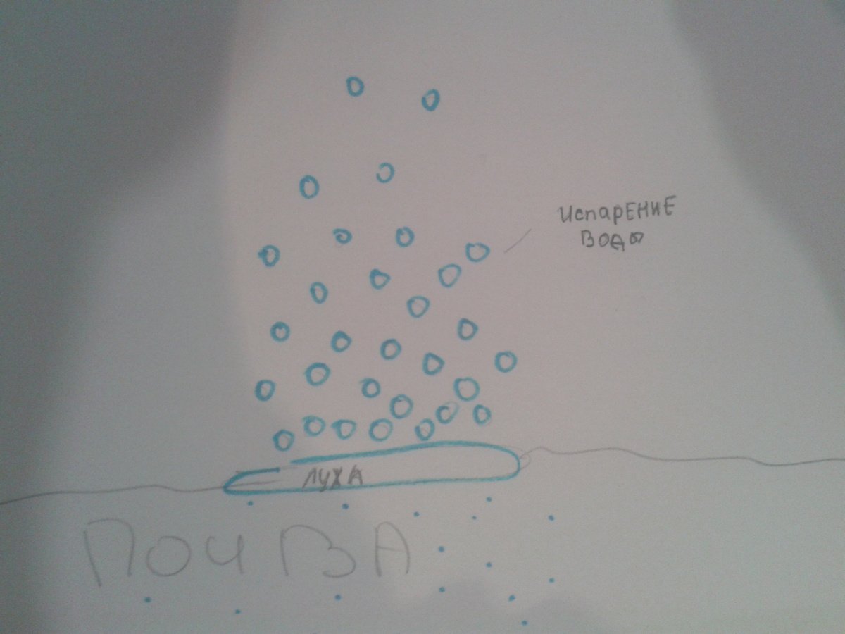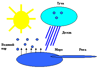 Лучи солнца попадают на воду, и из-за этого вода испаряется. Частицы воды поднимаются вверх и благодаря этому получается облачко. А из облака потом пойдет дождь. Надеюсь всё понятно.