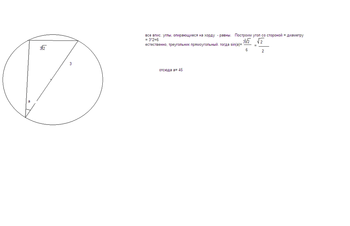 Радиус окружности равен 3. Найдите величину острого вписанного угла , опирающегося на хорду , равную 3 корень из 2