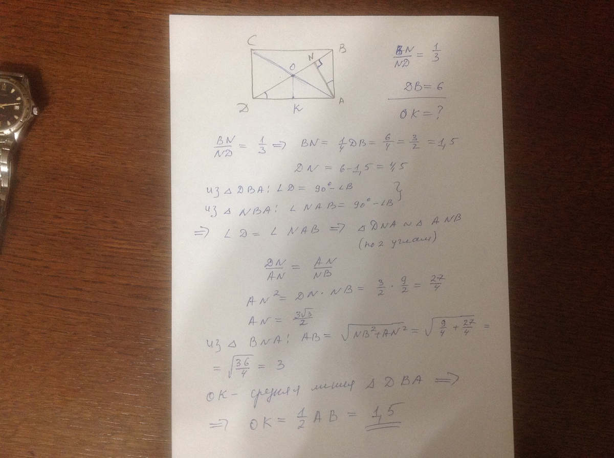 Перпендикуляр, опущенный из вершины угла А прямоугольника АВСD на не проходящую через эту вершину диагональ, делит ее в отношении 1:3, считая от вершины В. Диагональ равна 6 см. Найдите расстояние от точки пересечения диагоналей до большей стороны.