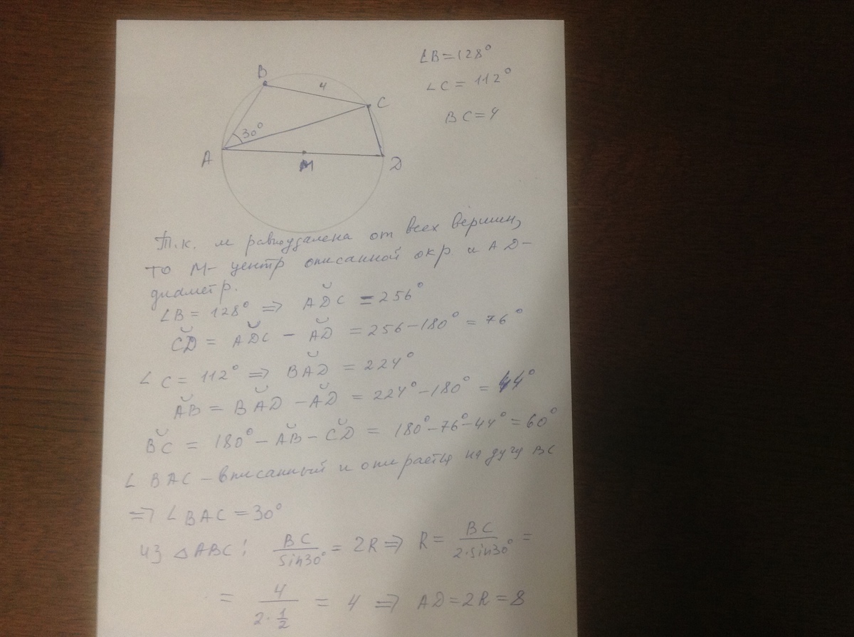 серидина M стороны AD выпуклого четырёхугольника ABCD равноудалена от всех его вершин .Найдите АD если BC=4,а углы B и C четырехугольника равны соответственно 128°и 112°