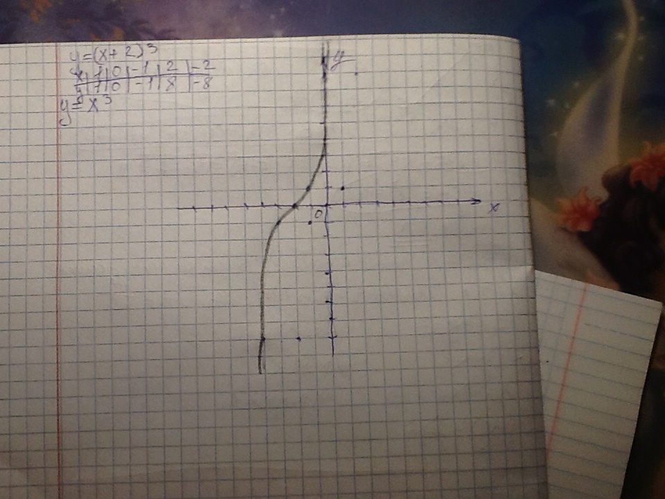 В общем вот, точки обычного графика Y=x^3 мы переносим на 2 влево, немного не аккуратно нарисовано, но думаю как сделать понятно, переносим влево, потому что +2 в скобках.