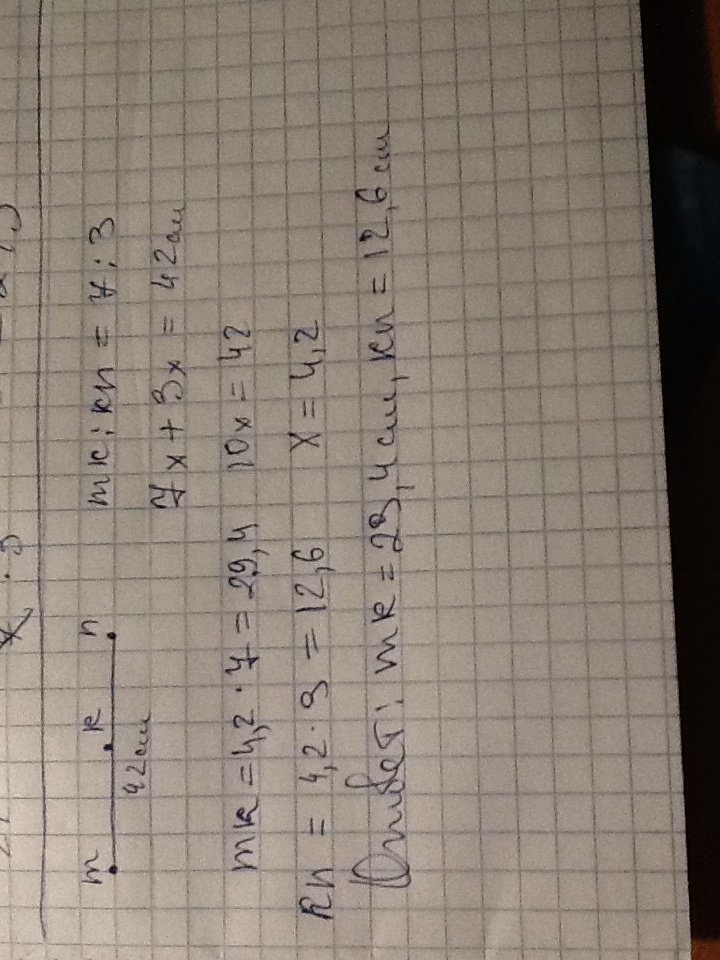 Mk относится к kn как 7 к 3 решим в виде уравнения 7х+3х=42
