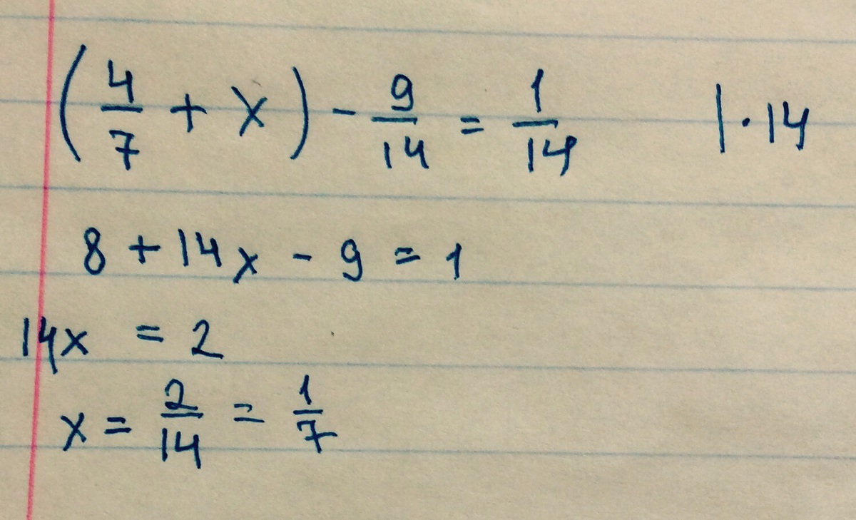 x - 1/14 = 1/4