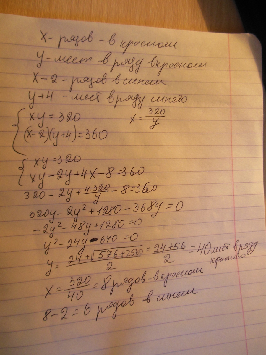 В красном зале кинотеатра 320 мест, а в синем - 360. В красном зале на 2 ряда больше , чем в синем, но в каждом ряду на 4 места меньше, чем в каждом ряду синего зала. Сколько рядов в каждом зале кинотеатра?