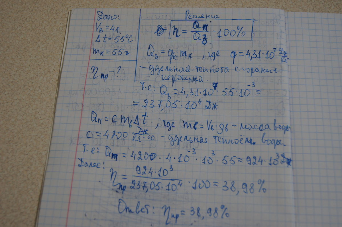 При нагревании 4 литров воды на 55 градусов воды примуса,сгорело 55 грамм керосина.Найди КПД примуса