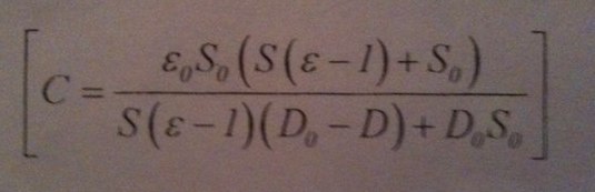 Определить емкость конденсатора с площадью пластин S0 и расстоянием D0 между ними, если в нем находится диэлектрическая пластина площадью S и толщиной D с диэлектрической проницаемостью E.