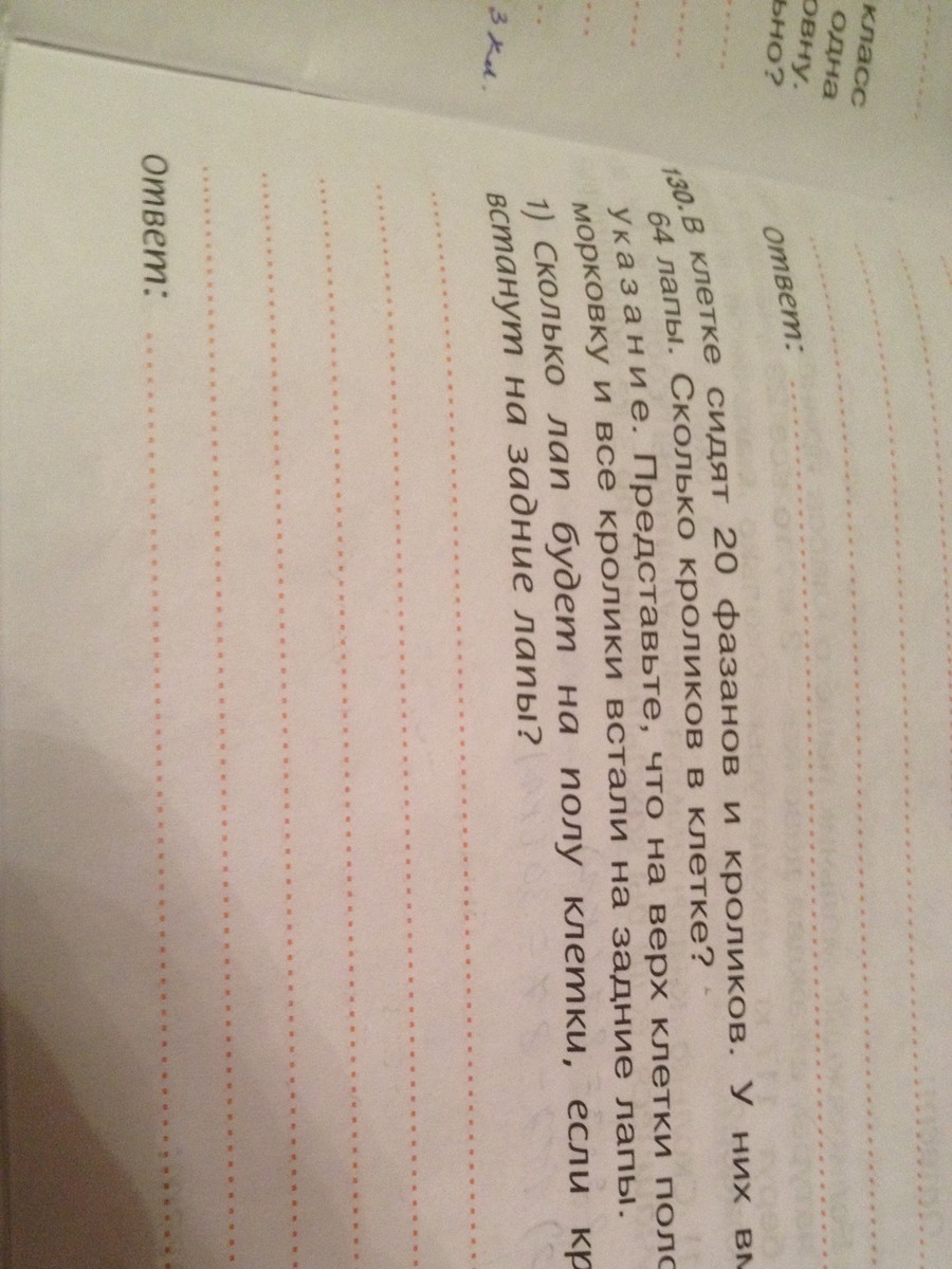 1)20 * 2=40 лап, будут на полу клетки,если кролики встанут на задние лапы.