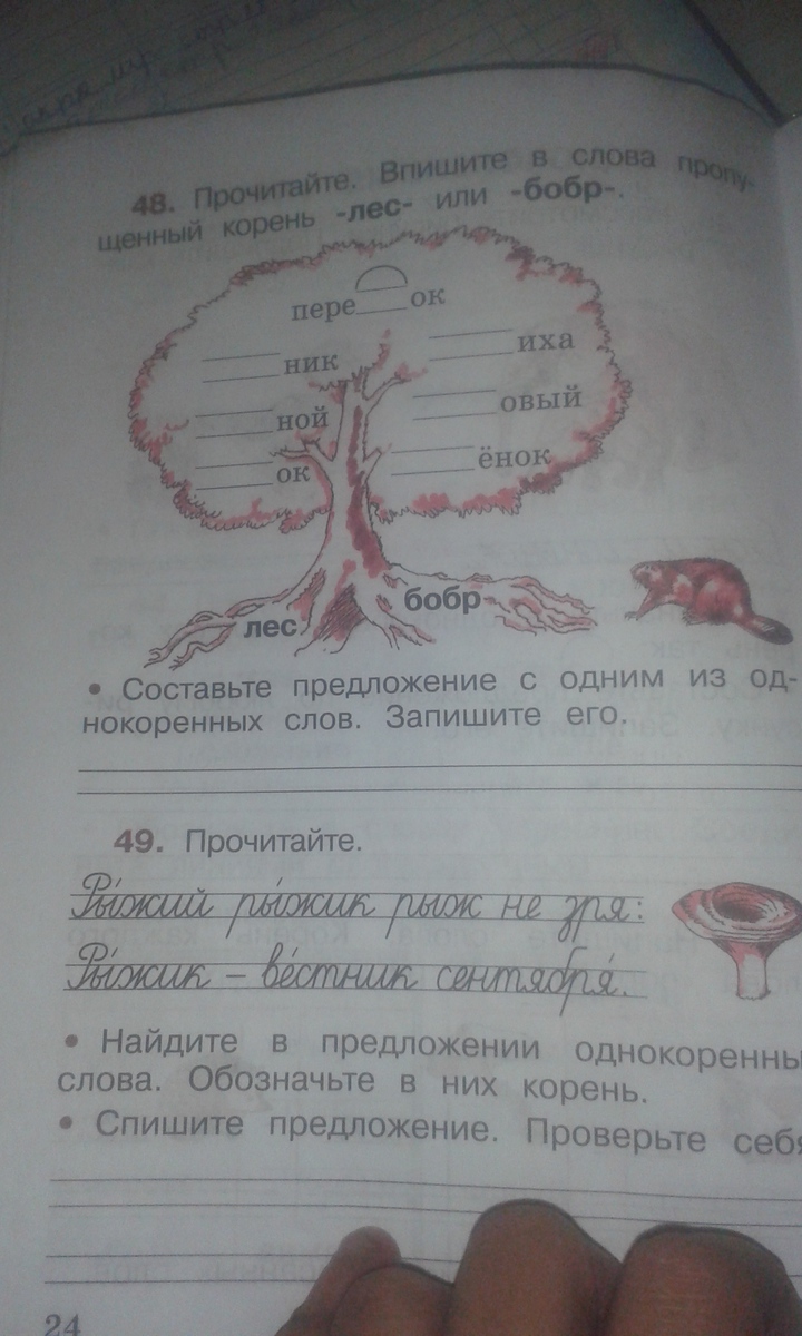 Лесной, лесник,лесочек. Бобр, бобренок, бобриный. Предложения например :через поле виднелся лесочек. Маленький бобренок грыз кору дерева.