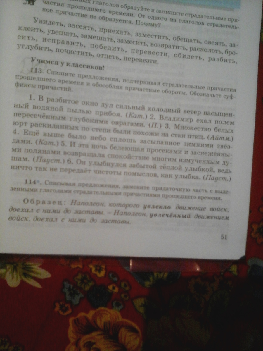 1. В разбитое окно дул сильный, холодный ветер, насыщенный водяной пылью прибоя. (перечисление). 2.Владимир ехал полем, пересеченным глубокими оврагами.(причастный оборот). 3.Множество белых юрт, раскиданных по степи, были похожи на стаи птиц. (причастный оборот).4. Еще выше было небо, сплошь засыпанное зимними звездами. (причастный оборот). 5. И эта ночь белеющая просеками и заснеженными полянами, возвращала спокойствие многим измученным душам. (причастный оборот). 6.Он улыбнулся заботой, теплой улыбкой, ведь ничто так не передает чистоты помыслов, как улыбка.