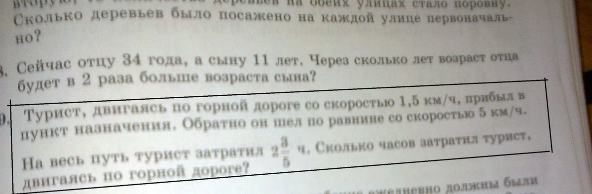 По горной дороге x часов, по равнине (2 3/5-x) часов. Туда он прошёл 1,5x км, обратно 5*(2 3/5-x). Расстояния равны, то есть