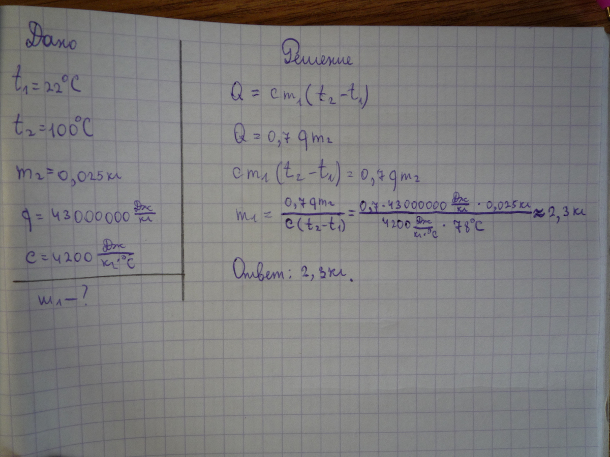 На керосиновой горелке нагревали воду от температуры 22 С до кипения. Определите массу воды, если масса сгоревшего керосина m2=0,025 кг, а потери теплоты в окружающую среду составили 30%. (Удельная теплота сгорания керосина q=43000000 Дж/кг, удельная теплоемкость воды с=4200 Дж/ кг* С , температура кипения воды 100 С ).