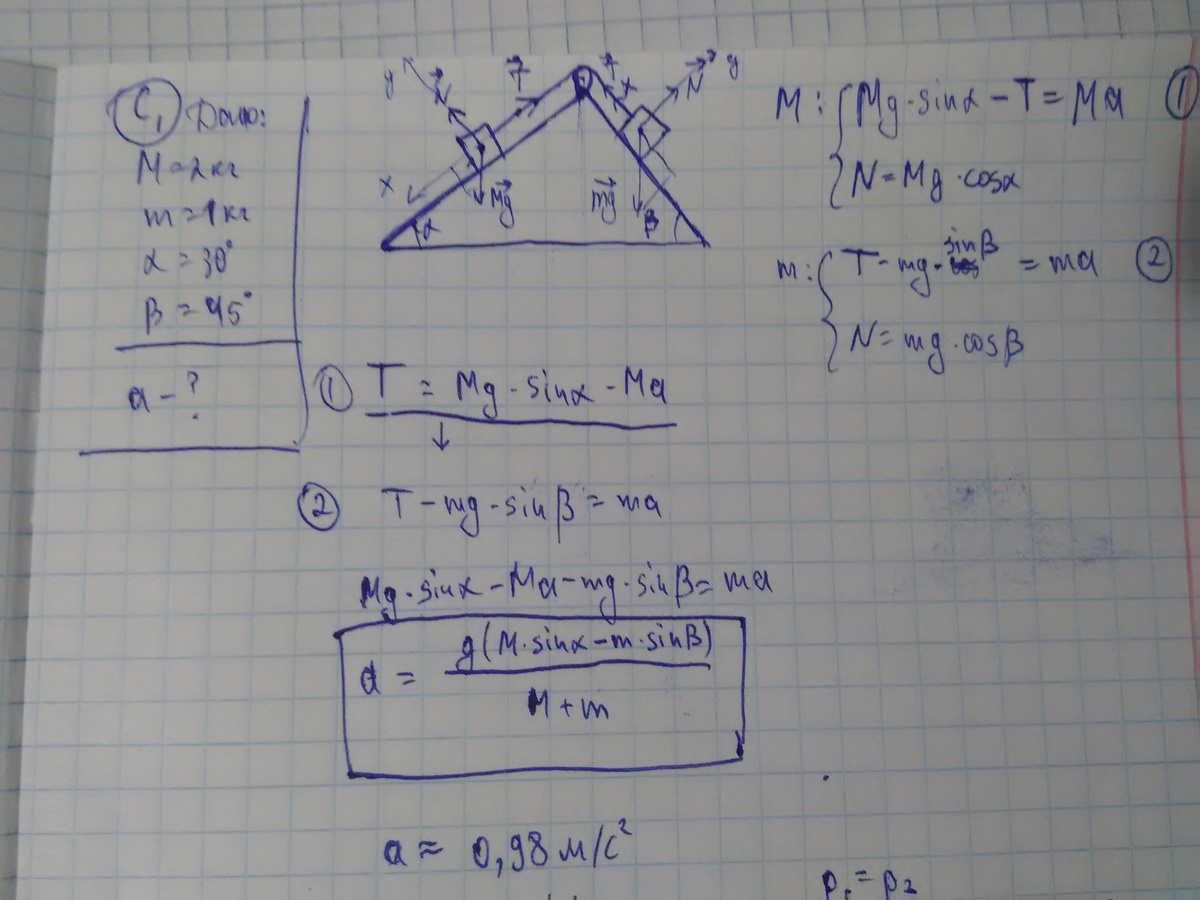 Грузы массами м=2кг и м=1кг лежат на закреплённом несимметричном клине,углы при основании которго альфа=30 градусов и бета=45 градусов.Нити нерастяжимы. Трения нет. Каково ускорение грузов? g=10м/с^2