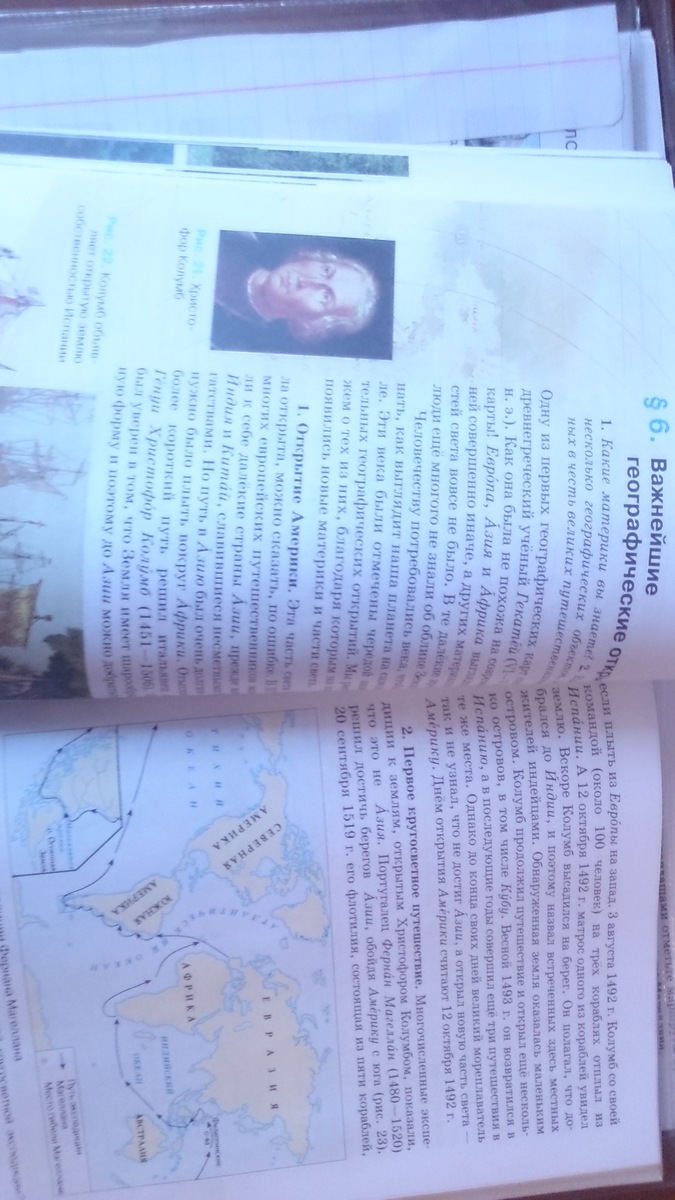 План:,,открытие Америки,, 1)Христофор Колумб (1451-1506г)-испанский мореплаватель,который был уверен в том,что Земля имеет форму шара.2)Он считал,что до Азии можно добраться,если плыть из Европы на запад.3)3.08.1492 год - Колумб отплыл из Испании на трёх кораблях.4)12.10.1492 год - один из матросов путешественника увидел землю ,вскоре Колумб высадился на берег.5)Мореплаватель думал,что добрался до Индии,поэтому назвал местных жителей индейцами.6)Земля оказалась небольшим островом.7)Продолжается путешествие и Колумб открыл остров Куба.8)Весна 1493 год - возвращение Колумба в Испанию.9)Затем,совершается ещё 3 путешествия в те же места.10)Христофор Колумб ,великий мореплаватель, так и не узнал,что он вовсе не достиг Азии,а открыл новую часть света - Америку. Вот и весь план!Напиши мне ,пожалуйста,авторов этого учебника,из которого ты сфотографировал страницу.Мне просто срочно надо приобрести этот учебник.Очень прошу.