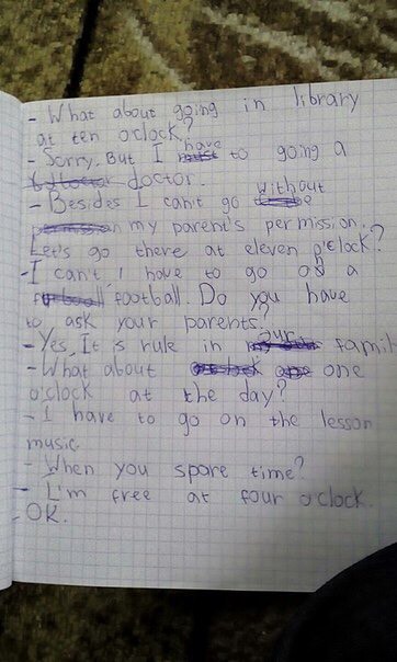 Как насчёт сходить в библиотеку в 10:00? Извини,но я должен идти к доктору. Жалко но мне нужно туда сходить,а родители заняты,как насчёт сходить туда в 11:00? Но я буду помогать родителям. А как насчёт сходить туда в 13:00 дня. Я буду слушать музыку. Когда у тебя будет свободное время? В 16:00 дня. Окей.