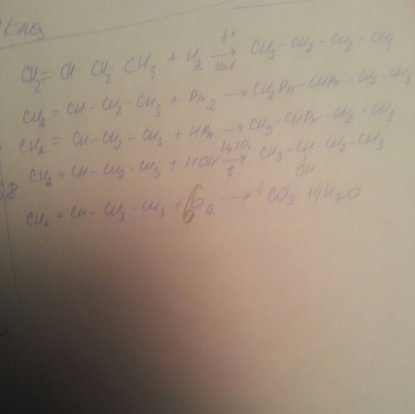 Составить уравнение реакций: гидрирование бутена 1 ,бромирование бутена 1, гидробронирование бутена 1 ,гидратация бутена 1 и горение бутена 1