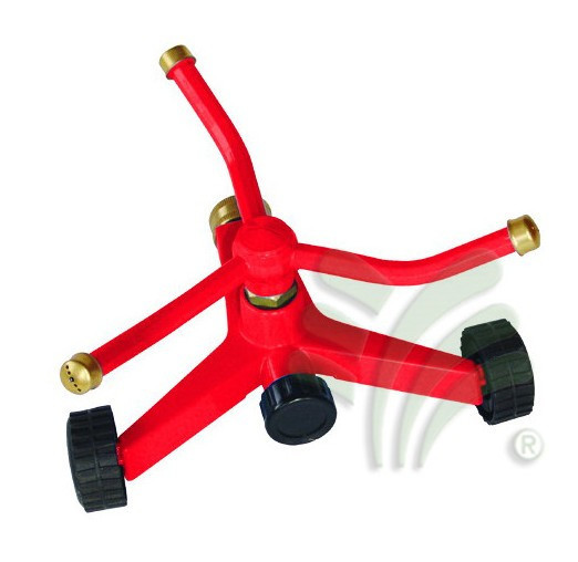 На вертикально стоящую водопроводную трубу делается насадка, способная вращаться вокруг оси трубы. На конце насадки - разветвление, перпендикулярное трубе и загнутое с двух концов параллельно земле так, что есть небольшой угол по отношению к разветвлению