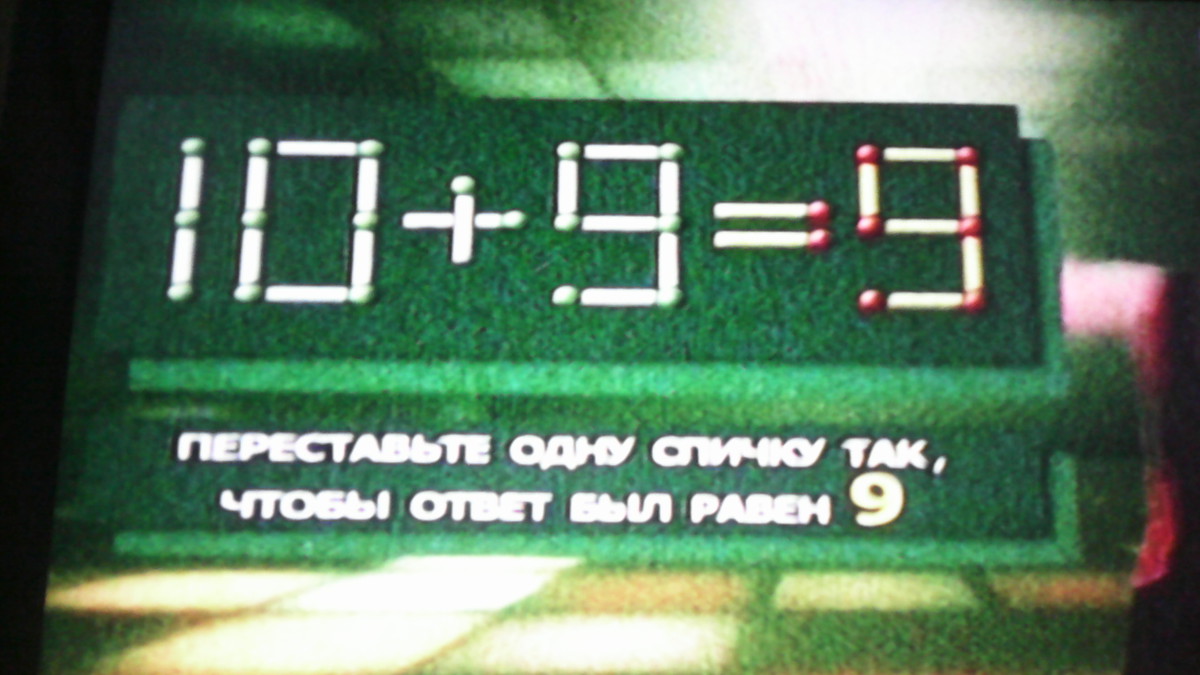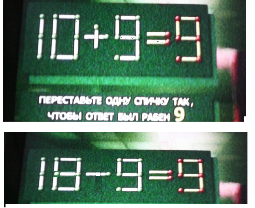 На рисунке неверное равенство. Чтобы оно стало верным, нужно вертикальную спичку из знака + переставить в цифру О. чтобы получилось