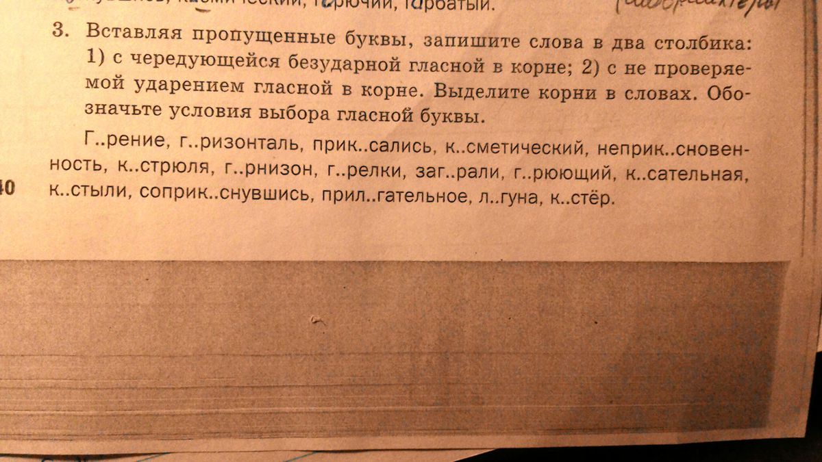 2) Слова с не проверяемой ударением гласной в корне: горизонталь, косметический, кастрюли, гарнизон, горюющий, костыли, прилагательное, лагуна, костер.
