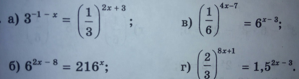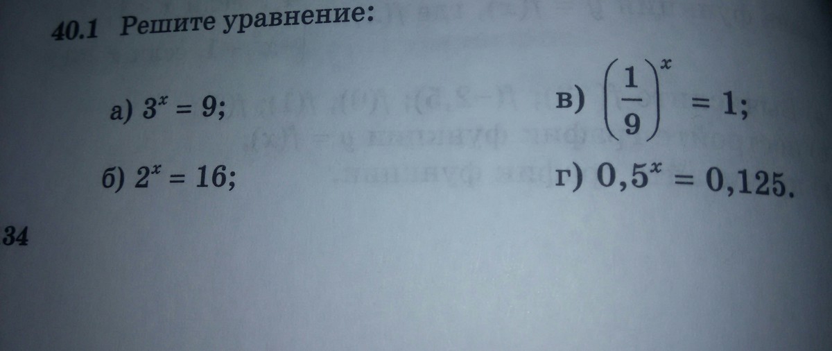 а) 3 в степени х =9. степень это число умноженное сколько то раз на себя. Вот аналогичный пример: 5 в степени 2 ( представь что двойка маленькая висит справа от пятерки.)