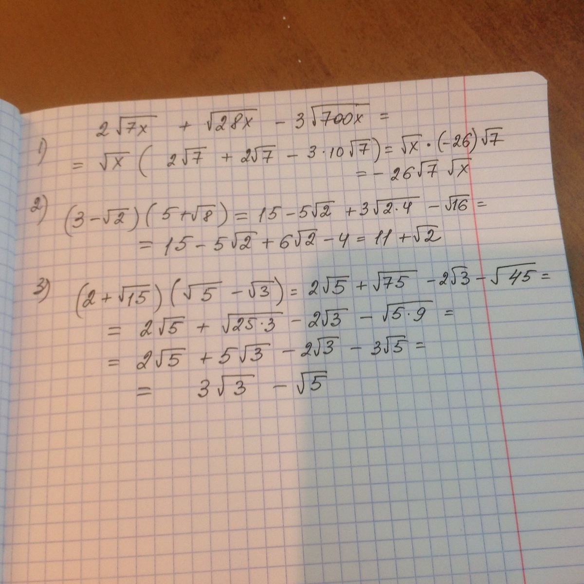 упростите выражения 1)2√7х+√28х-3√700х 2)(3-√2)*(5+√8) 3)(2+√15)*(√5-√3)Помогите пожалуйста