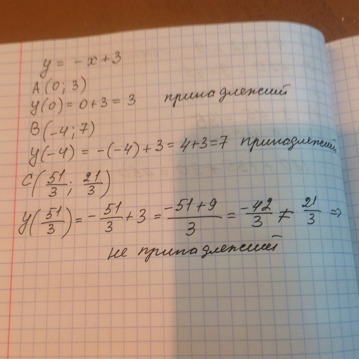 Какие из точек А( 0; 3), В( -4; 7), С(51/3 ; 21/3) принадлежат графику функции y = - x + 3